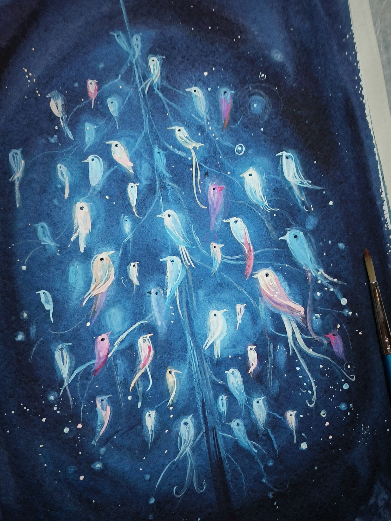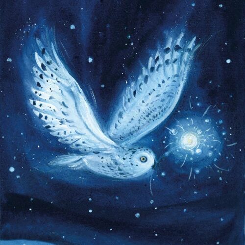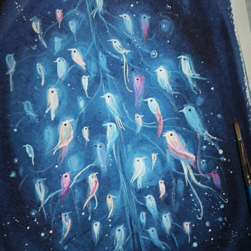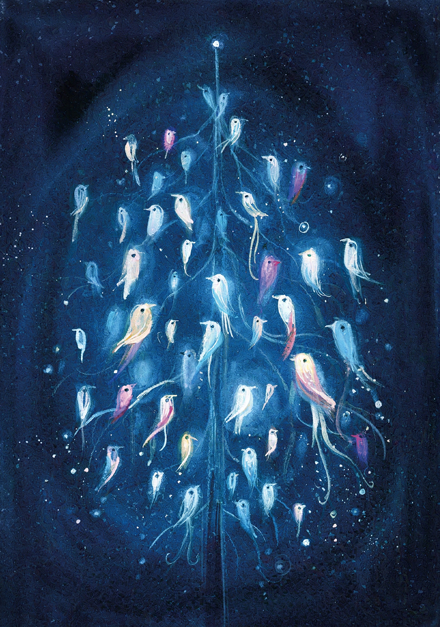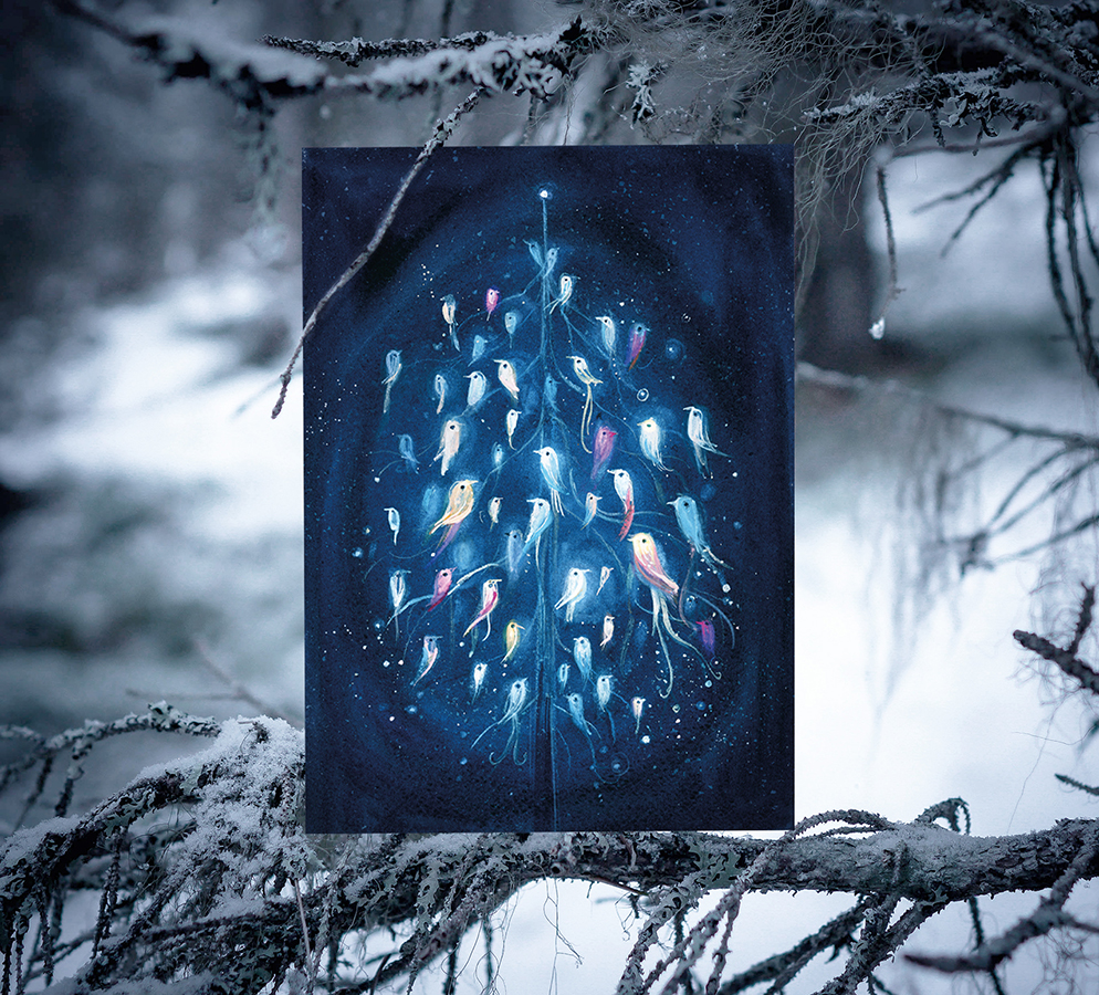 The illustration from this Christmas card set is inspired by the beautiful colourful birds that you can see here in the north during the wintertime. Most birds migrate south during the long winter period of the arctic north, but some stay here and overwinter. They suddenly appear like bright flashes of colour, dancing around in the white of the snow.