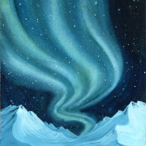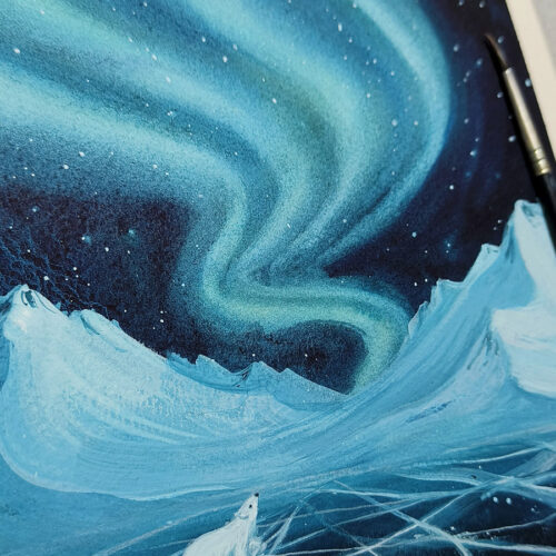 This watercolourpainting is inspired by the magic of the arctic winter and the wildlife of the Arctic. The painting is created with watercolours on 300 gr. Winsor and Newton aquarelle paper.